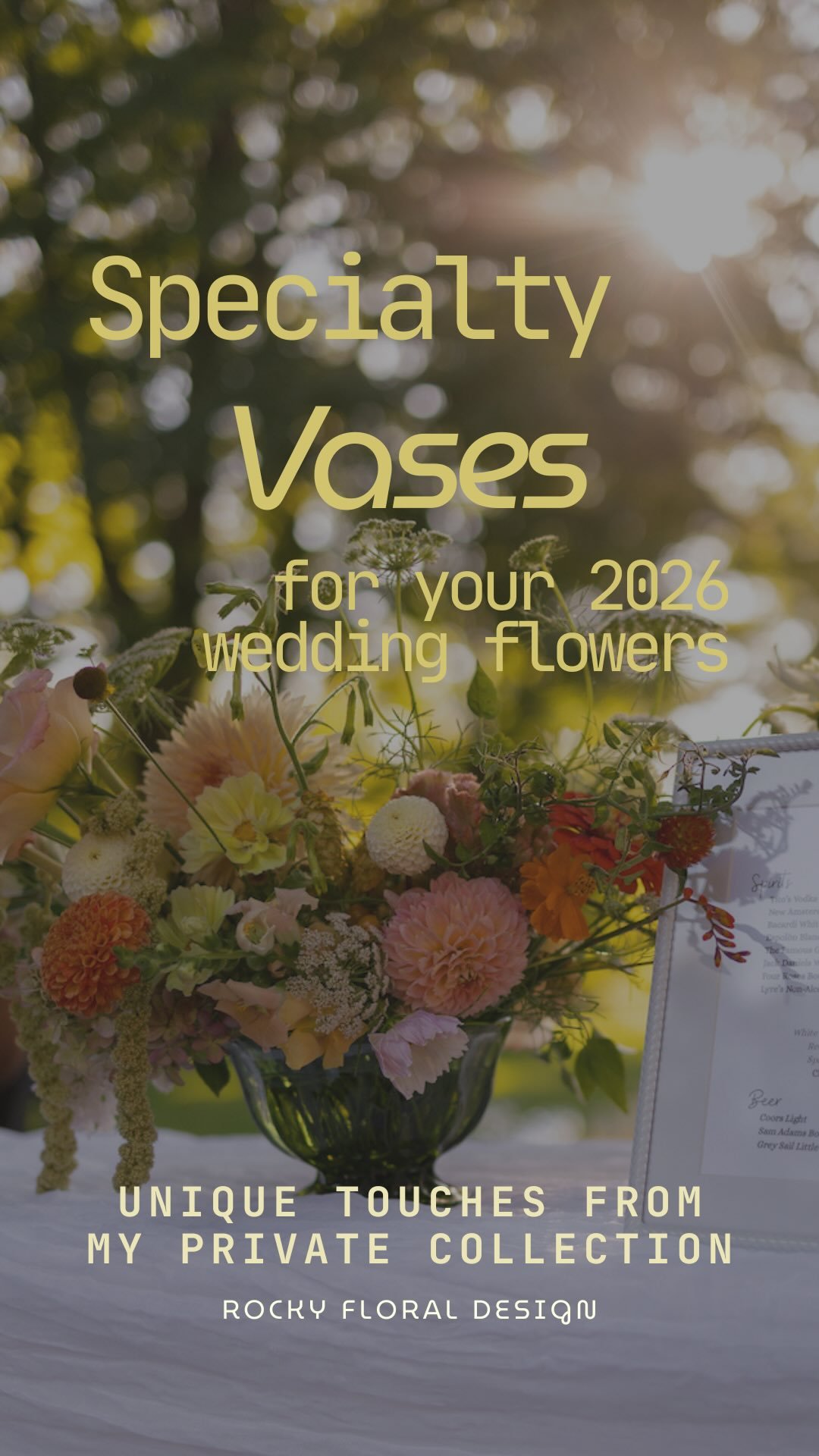 Sustainability is foundational to Rocky Floral, from my regenerative pesticide-free flower farm to your event designs. All florals are composted after event break down, feeding back into the soil they came from. All vessels are cleaned and reused, and plastics are minimized at all opportunities.